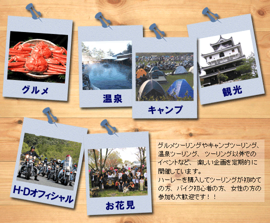 から始まり、近場の日帰りツーリング、グルメ ツーリングなど、家族ぐるみで親睦を深めることができる楽しい企画が目白押しです。